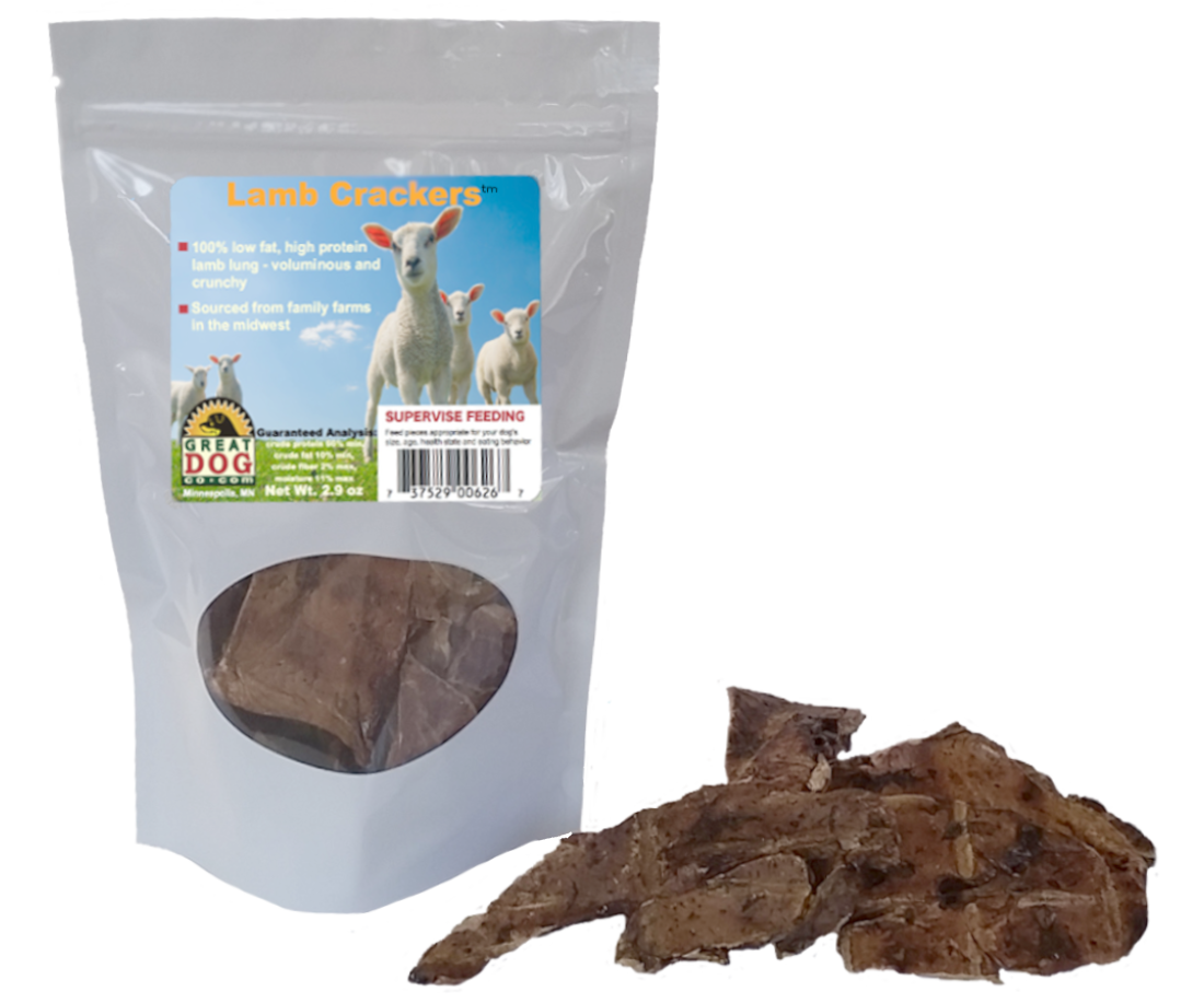 • 1 – 2.9 oz Bag of GREAT DOG Lamb Crackers (Lamb Lung Treats)