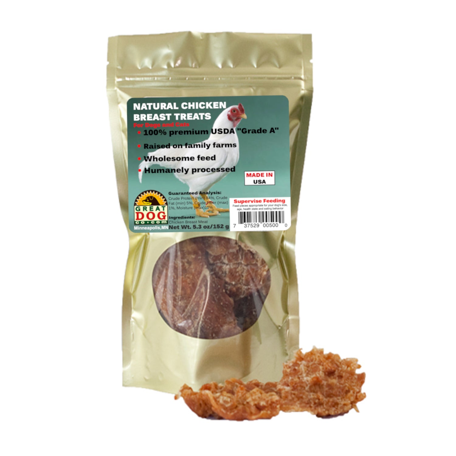 - Made from 100% human-grade chicken breasts sourced in the USA