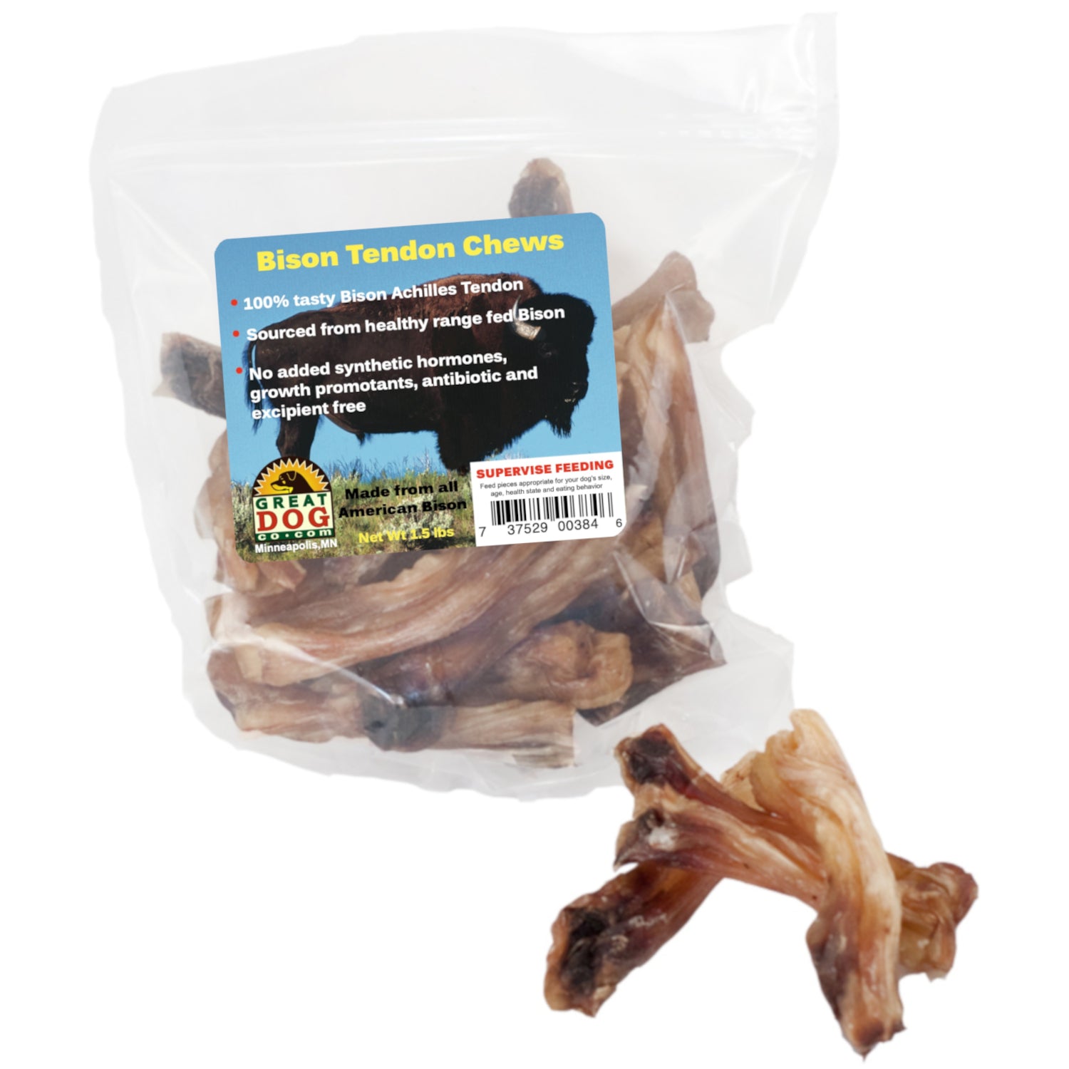 1.5 pound resealable bag contains approximately 20–22 Bison Achilles Tendon Chews
